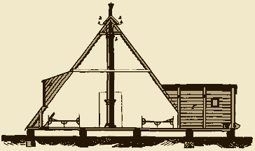 The buildings were wedge-shaped, the roof forming at the same time the walls; a barrack thus resembled a long prism resting on one of its faces. Each barrack was slightly elevated from the ground; it had two doors, one at each end, and was lighted by dormer windows. The ridge was open, and covered by a false roof or lantern. The ventilation was, however, effected principally by a modification of the system which I have already described, when speaking of the barrack at the Charity Hospital, in Berlin. The walls and floors of these wedge-shaped barracks were double; the exterior covering of the wall was made of plain boards, covered with tarred paper; the interior was formed by a wainscoting of clap-boards. The ward was thus enveloped by an air-chamber, which communicated with the ward by an open seam, on each side, along the line of the floor. The barrack was heated by four stoves, the smoke pipes from which entered shafts communicating with the air space beneath the double floor. The character of the construction, and the system of ventilation, will be made evident by a reference to the accompanying diagram. (Fig. 3.)