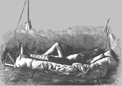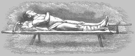 On this stretcher the wounded man can be borne with perfect safety to the limb, by hand, in cars, in boats, or in ambulance waggons built to receive the litter, or even in common freight railway waggons, provided they are so arranged that the weight of the body may rest upon the extreme ends of the stretcher. In this way the elasticity of the wood from which the stretcher is constructed is utilized, and the bruises or injuries avoided which might ensue from the shocks and jolts produced by the roughness of the road over which the carriage passes. No number of consecutive stoppages, either for hours or days, could in any way interfere with the process of restoration, provided the man be as well cared for as at first, and not removed from the stretcher.