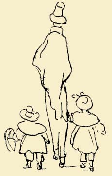 She did not attach herself to her mother. The companion of her childhood was W. E. N. Among the Verney Nightingale papers is preserved a sketch by Julia Smith, Fanny's unmarried younger sister, of W. E. N. and the two little girls. The trio have their backs to the artist. W. E. N., in frock-coat and top-hat, is in the middle, tall and thin as a hop pole; the two children, one on each side, wear pantalettes and broad brimmed hats. Parthe, as Aunt Julia points out in a note scribbled below the sketch, clings to her father's coat-tail while Flo "independently stumps along by herself."