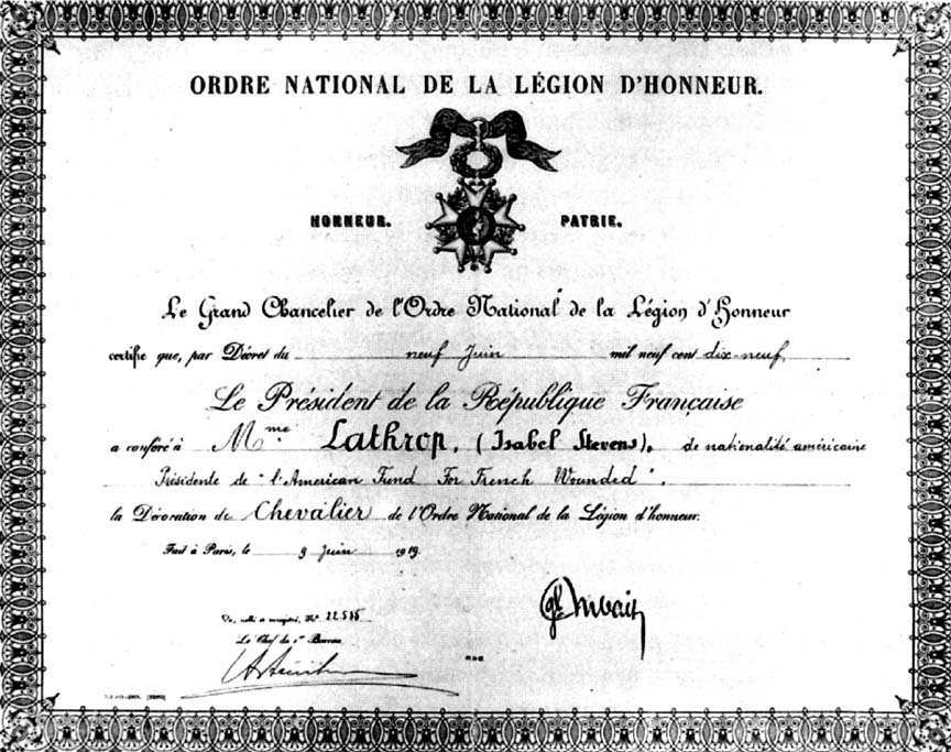 National Order of the Legion of Honor, Diploma of Chevalier of the Legion of Honor of Isabel Stevens Lathrop, 9 June 1919 (cat. 122). President of the American Fund for French Wounded during the War, which brought her the Legion of Honor, Mrs. Lathrop continued her activities afterwards; she was notably the initiator of the American Memorial Hospital of Rheims, inaugurated in 1925. Nonetheless, she remained at the rank of Chevalier. |