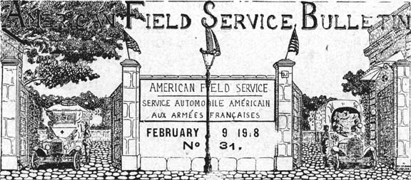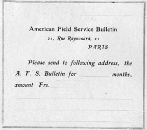 The Field Service Store wishes to remind the readers of the "Bulletin" that, as announced in a previous issue, a Purchasing Department has been started to enable any former members of the Field Service to have articles of any kind purchased for them in Paris at cheaper rates than they would otherwise expect to obtain. All communications should be addressed to the Manager of the Store, American Field Service, 21, rue Raynouard, Paris.