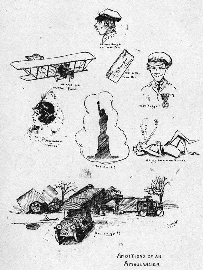 So my dear Old Lady you will not be able to tell when you see an Ambulance go by what old Field Service Section it was because it will be out of sight by the time your mental processes have worked sufficiently. Save your mind the work. And here is a secret. It may not be a Field Service Section. after all They are using our "style of buss". This is in the bosom of the family. Theirs fell apart just as ours did in the Spring of 1915. "Oh! we can improve on the Field Service body. " Can't be done over night. But this is beside the point.