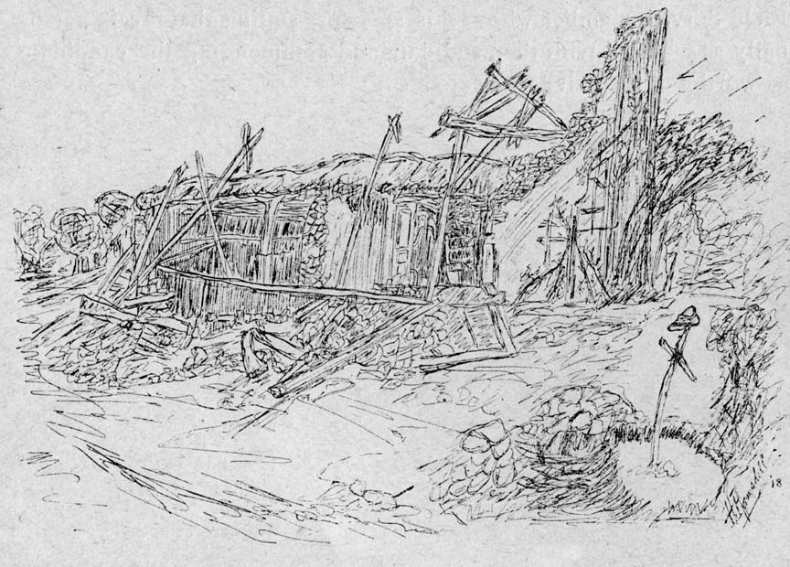 It was all as desolate as the world on the fourth day of creation ere yet there had been any plants or living things created, and to add to the general gloom that night there was a light rain falling and it was dark. We were not firing but the men in the line eight hundred yards ahead of us were active with bombs and machine guns. There was mud underfoot and mist in the air.