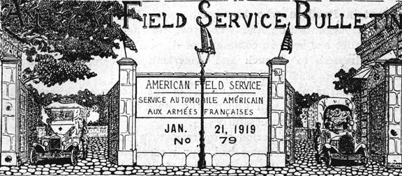 I am thankful receiver of several of your "Field Service Bulletins". It has been quite a pleasure to get these bulletins and to see that the old Ambulance Service is being held together by such a bond. Surely no one of the men who served in this service in the early days before the entrance of the United States into this war can forget the ties or what it means today, to feel that you at least tried to be of some service, not only to France --- the name has always implied chivalry to me --- but even to our own people by being in the ambulance service. As I look back I feel personally that though some of us did not do so much there, that the mere fact of our being over here and with the French, was proof positive of our undying friendship and love for France. The little hardships, if there were any, that were gone through in those days are forgotten, and there only remains an ideal which so many men, no one need be ashamed to say a sample of America's best, were trying to follow.