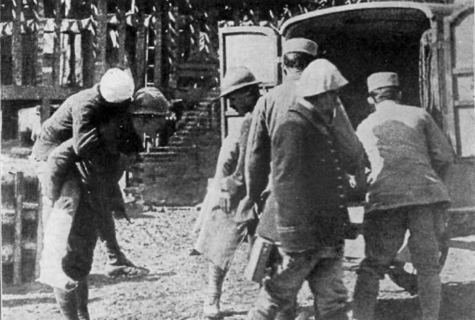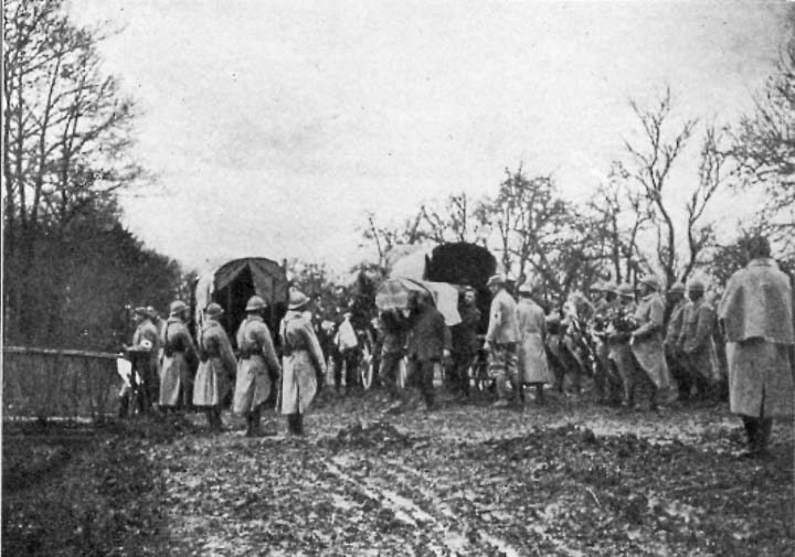 We found the driving station at Dugny overflowing with wounded and the men placed in rows on straw in a stable. Again we filled our cars, this time mostly with couchés, as before gas victims. It was now broad daylight. The roadway even at night was a mass of traffic, mostly convoys of heavy camions. These followed each other in an endless belt, the loaded ones coming toward Verdun, the unloaded going away. They proceeded at an average speed of eighteen kilometres an hour at a distance of sixty feet from each other. It became necessary for us, if we were to make any progress at all, to squirm our way through the maze, continually dodging in and out of the convoys to avoid staff cars, yet always working by the slower moving vehicles. It was the most trying kind of driving and required extreme care lest our cars be crushed beneath the giant munition trucks or lest the unforgivable sin of causing a block be committed. It was disheartening to work by a convoy of eighty camions, dodging in and out to avoid cars coming in the opposite direction, and then just as the head of the line was reached to have a tire go bang. It is such happenings that try the soul of the ambulancier.