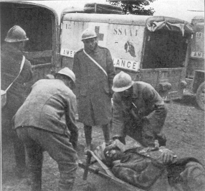 The fighting on both sides, especially the artillery activity, continued heavy day and night and reacted on us. Every car in the Section received its quota of shell-holes, one car driven by Ryan being utterly demolished while standing in front of the poste of Carrière Sud. A short time before the sides of two cars --- driven by Flynn and Tapley --- had been blown out by shells at Haudromont. On several occasions shells exploded near ambulances on the road, when the couchés inside the car became so frightened that they jumped off their stretchers and took refuge in near-by abris. At times it was impossible to go through and we had first of all to repair the road ourselves by filling the holes with loose rocks and earth. Holt was badly gassed near Haudromont, a shell exploding near him while he was standing beside his car waiting for a congestion of artillery caissons and guns to let him through. He was knocked down, his mask fell off, and he was rendered practically unconscious. After being dragged to a poste de secours and given the anti-gas treatment, he insisted upon resuming work, for which he received a fine citation.