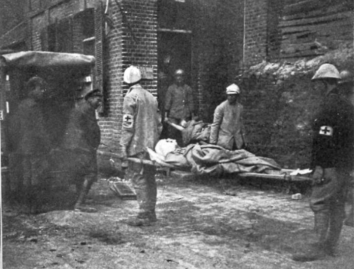 The dressing-station was located in what in peace times was the town hall, or mairie, a two-story brick building having a central structure flanked by two small wings. The building was banked with sandbags which, while not rendering it by any means shell-proof, did protect it from shrapnel and éclats. The central room was devoted to the wounded, who were brought in from the trenches on little two-wheeled, hand-pushed trucks, each truck supporting one stretcher. A shallow trough was built around the sides of the room and in this, upon straw, the wounded were placed in rows, while awaiting the doctor. In this portion of the building was also located the mortuary where those who died after being brought in were placed preparatory to burial. The bodies were placed two on a stretcher, the head of one resting on the feet of another. It was a ghastly place, this little room, with its silent, mangled tenants lying there awaiting their last bivouac. On one side of the room was a small, silver crucifix above which hung the tricolored flag of the Republic guarding those who had died that it might live.