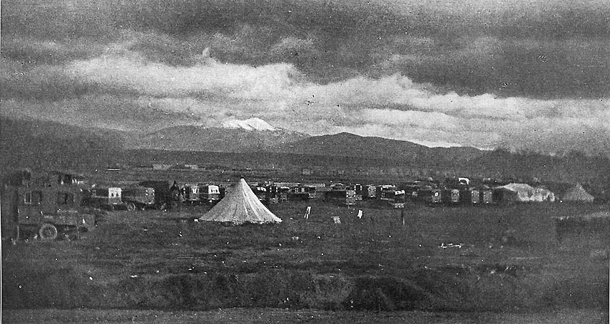 As the days went by, our camp-site, where we were the first comers, began to assume the aspect of a boom mining town. Several camion sections appeared. Numerous ravitaillement groups moved in. Tents and nondescript structures of earth and ammunition boxes sprang up. Across the river ten thousand Russians were encamped, and all night their singing came to us beautifully across the water. All day and all night, war's traffic ground and creaked by us. The lines had shaken down; the two forces were now entrenched, facing each other just beyond Monastir, and the transport was accumulating munitions for an offensive. In the first camp opposite struggled long lines of Serbian carts --- carts such as Adam used to bring the hay in. The sad-faced burros plodded by, loaded with everything from bread to bodies. Soldiers --- French, Italian, Serb, and Russian---slogged by. But this activity was confined to the narrow zone of the roads. Beyond, the grim, desolate country preserved its lonesomeness and impressed upon the soul of man the bleakness and harshness of a land forlorn. For the most part the days were gray and sombre, with low-hanging clouds which frequently gave out rain and sleet and caused the river to rise so that more than once we were in danger of being flooded out. But occasionally there would be a clear morning, when the clouds were driven back and the rising sun would light the mountains, turning the snow to rose and orange. We were growing very tired of the evacuation work, of the long, weary runs. There was no excitement to tinge the monotony. We were becoming "fed up." The Squad, therefore, hailed with joy the news that the Section was to move up to Monastir and there take up the front-line work.