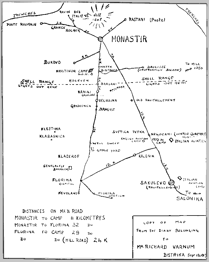 We started to join the Division on May 31, going that day as far as the English hospital for Serbs at Vertekop, via the main road from Monastir to Salonica. The first village passed through 'was the hillside town of Banica; thence up over a pass by the battle-field of Gornitchevo, where the Serbians and Bulgars fought in October, 1916; on to Ostrovo (at the northern end of the lake of the same name) and Vodena. From there on to Vertekop it was easy rolling, mostly downhill.