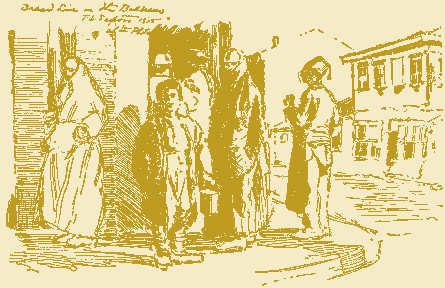 At first we found the twisted streets very confusing. They rarely held their direction for more than a hundred yards and their narrowness prevented any "observation for position." There seemed no names or identifications either for streets or quarters, and did one inquire the way of some befezzed old Turk, the reply would be "Kim bilir Allah" --- Who knows? God. But gradually we grew to know these ways until on the darkest of nights we could make our way through the mazy blackness.