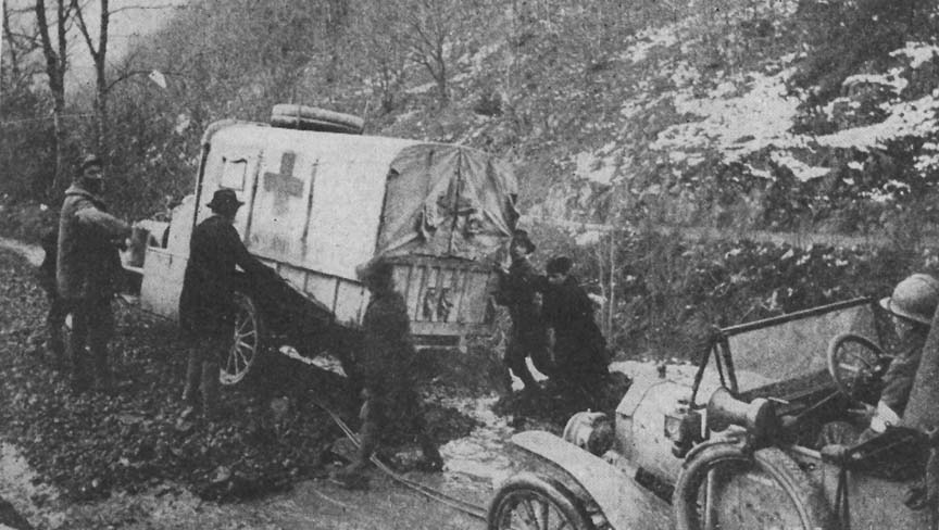 Our troubles in maintaining the service were caused by mountains and poor roads. The first day, Walter Chrystie's car was assisted to the top of the Ballon de Guebwiller by horses, while my car, going to the poste near Hartmannsweilerkopf, simply expired three times, on each of which occasions a total change of water in the radiator was necessary. An hour in low gear seemed too much. However, practice and removing carbon from cylinders told in our favor to such an extent that finally we could make the grades unassisted.