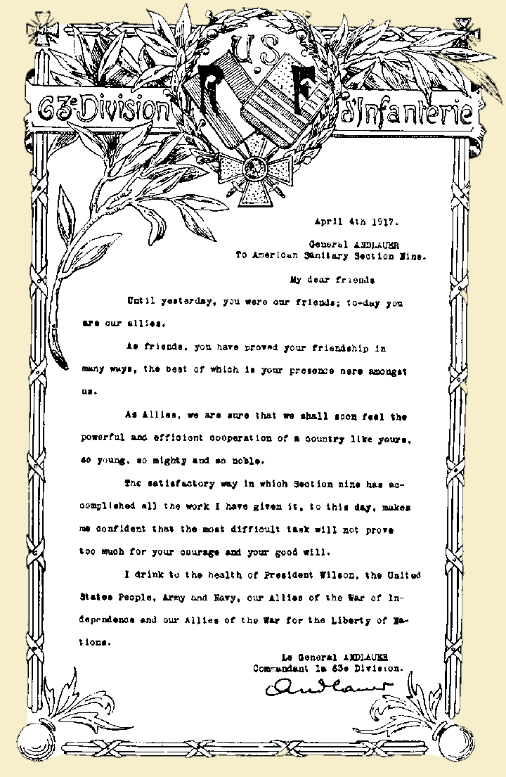 The names of the donors were only known at the time to the officers of the Field Service, but the nameless benefactors maintained throughout the war deep interest in the work of the Section, and in the welfare and achievements of its members, sending them continually articles for their comfort and convenience. We believe it only appropriate to-day to state that the donors of this Section were Mr. and Mrs. Robert Woods Bliss.