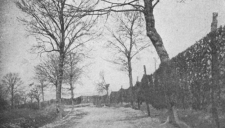 The "Boyau" was approached by a road that ran out from Thuizy for about three kilometres to a cross-road artillery observation post, called the "Pyramides," where, turning to the left for a distance of a kilometre and a quarter, it crossed two lines of old trenches and ended at a sap, fed from the third-line trench. Here was the dressing station. There was no cover for our cars, which were in sight of the Boches, who, however, never shelled us here, except on one or two occasions when the ambulanciers got too careless in wandering around the neighborhood, when there would be eventually a grand hegira for cover. In order not to risk losing all the cars by one unlucky shell, we made three groups of the seven cars assigned to the Boyau. The first of these groups consisted of three cars, parked on the outskirts of Thuizy; the second, of two cars, hidden in a belt of woods just before one reached the cross-roads; while the third consisted of two cars at the Boyau. It may be added, in passing, that at these postes five of our cars were actually hit.