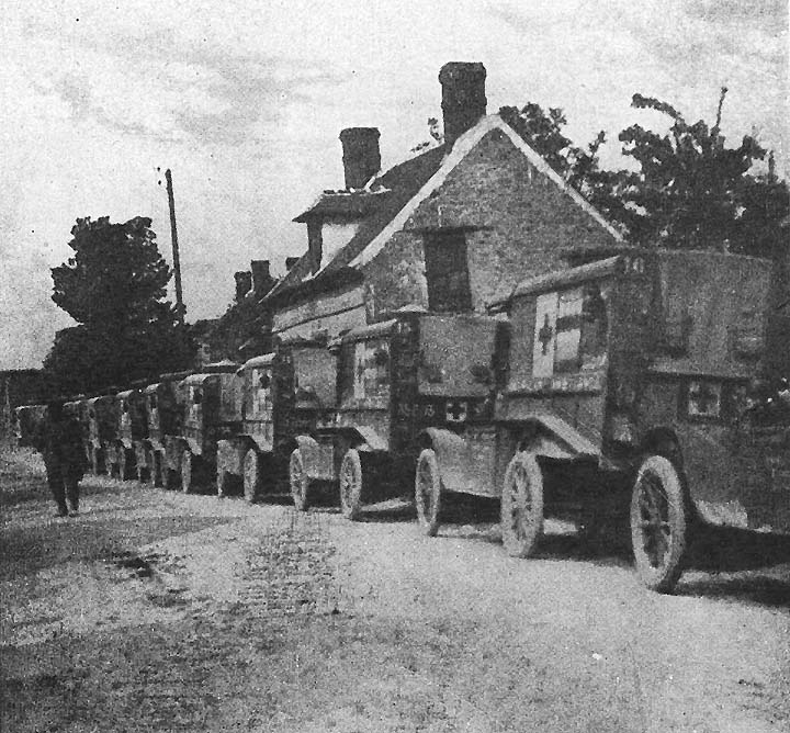Three days later, at two o'clock in the afternoon, the attack commenced, and by midnight the wounded began to arrive, at first in driblets, then more and more numerous. The next morning at eleven we received a message asking if we could spare five cars to the triage hospital at Pont d'Issu. This poste was served by a section of French ambulances, but there were more wounded than they could take care of. So five of us were assigned to this duty, which, on account of weather and road conditions, it was not easy to perform, for the route over which we were to transport our blessés was for the first three kilometres a sunken road running along a canal, and in a terrible condition, due to the heavy traffic of the past week and the constant rains. It was necessary to use low speed for this entire distance, and, even then, run as slowly as possible, to get your men through alive. The remaining seven kilometres were macadamized, and, with the usual bumps, choked day and night with three lines of camions, caissons, troops and all the other paraphernalia of war.