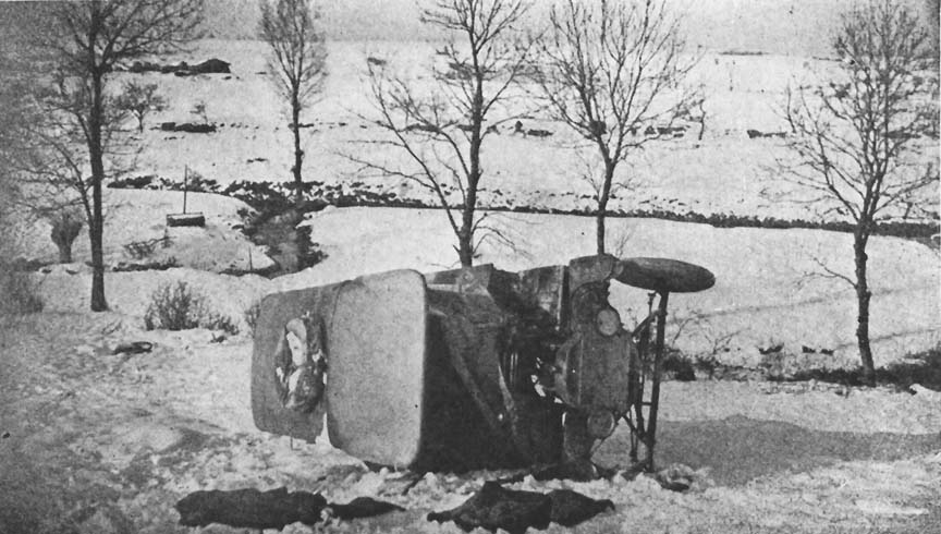 Anyhow, we went at a rush and got through the town without mishap, although a shell hit behind us just off the road. Then we faced the shrapnel. We waited this out, and halfway between, at a suitable moment, we tore up to the poste, backed up in a second, and beat it for the shelter. Immediately after, two shells fell twenty yards away, but without hitting the car.