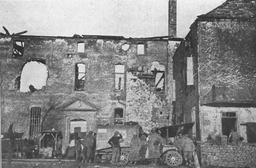 WE left Jouy at 9 A.M. to-day and Section Thirty-One took our place. We reached this village at 11 A.M. The kitchen trailer was delayed, so we went forth in search of food. After many rebuffs and failures, four of us found ourselves in the back room of a tumble-down house that we reached by going through a stable and up three steps. The room was bare, but very clean, and with a cheerful fire burning on a wide hearth. Two old women served us with fried potatoes, cider, and pears, which, added to the tins of meat and huge loaf of bread and cheese we had bought, made a very substantial meal. The women told us a pathetic story of the vandalism and wanton destruction of the Huns when they occupied the village before the Battle of the Marne, All the furniture and goods were transported to Germany and the houses were then burned. The English, with customary thoroughness, gave to each of the inhabitants of the destroyed villages around here---a bed, some clothes, a rooster, a hen and a cow.