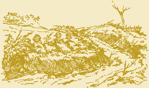 Almost hidden in the thick underbrush near by was the little cemetery, roughly fenced and reverently, though of necessity rudely, tended. Sunlit mornings, with birds trilling among the boughs, and patches of clear sky quivering through the foliage, one could glimpse the flash, so gay and brave and piteous, of the tricolor discs on the simple crosses, and a casque, perhaps, lying on a bare mound, or a torn, pitiful, graying képi. Sweet wild raspberries grew in dew-decked profusion close up to its very gate, while not a hundred metres away a battery squatted, hidden safely, and shivered the song of life with its shrieking. For a long time, until the tops of our high trees were combed away, shells from the battery would burst against the branches above the poste and wound. It was one of the inevitable things of woodland warfare.