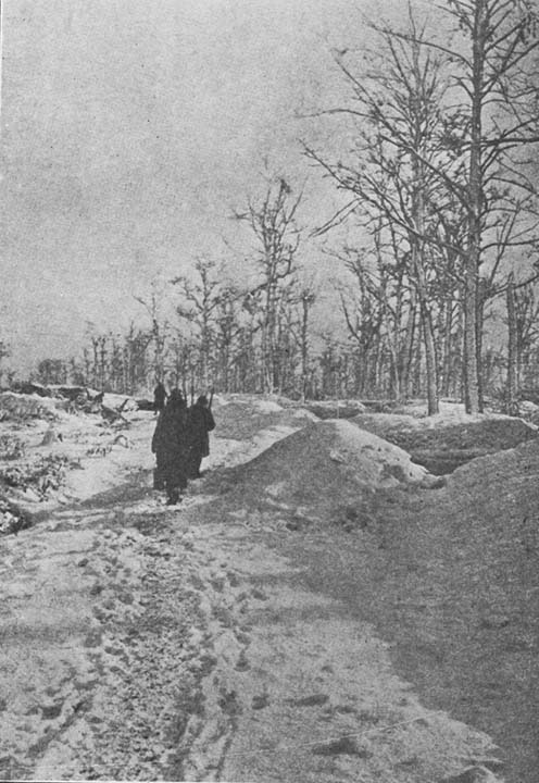 After dinner I set off to gain the observatoire and see some of the enemy country. After following a bewildering, winding line of trenches and wire entanglements along the crest of the hill, I finally arrived and was cordially shown around by the poilus there. Through a pair of periscope glasses which were carefully concealed by the camouflage, I could see the immense clouds of dust raised as our shells arrived from time to time. Through another glass I saw the ruined village of Montfaucon, and the tree observatory which was being shelled. A large road which ran along in full view was completely torn up by shell-holes. A careful scrutiny of the map which was suspended at one side gave me a more intimate acquaintance with the exact locations of the trenches on 304.