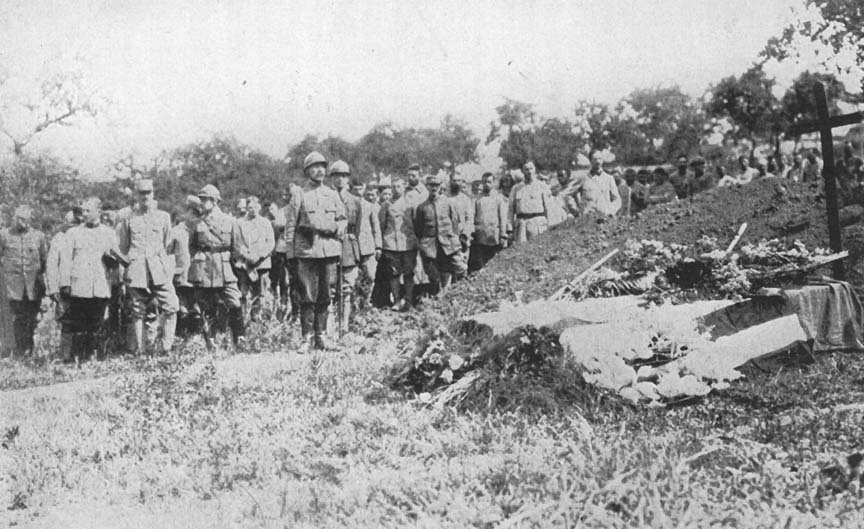 The following day we honored their memory as best we could when we buried their bodies in the military cemetery at Beaurieux, where row after row of French soldiers' graves preceded theirs and row after row have since been added. The ceremony was deeply impressive. Members of the Section bore the two coffins and laid them beside the open grave-trench, covered them with the French and the American flags, and surrounded them with flowers they had picked. In the presence of General Niessel of the Army Corps, General Lancrenon of our Division, Mr. Andrew the head of the Field Service, and many other officers and men, the Chaplain conducted the burial service, while the bang and burst of artillery were blended and contrasted with his words.