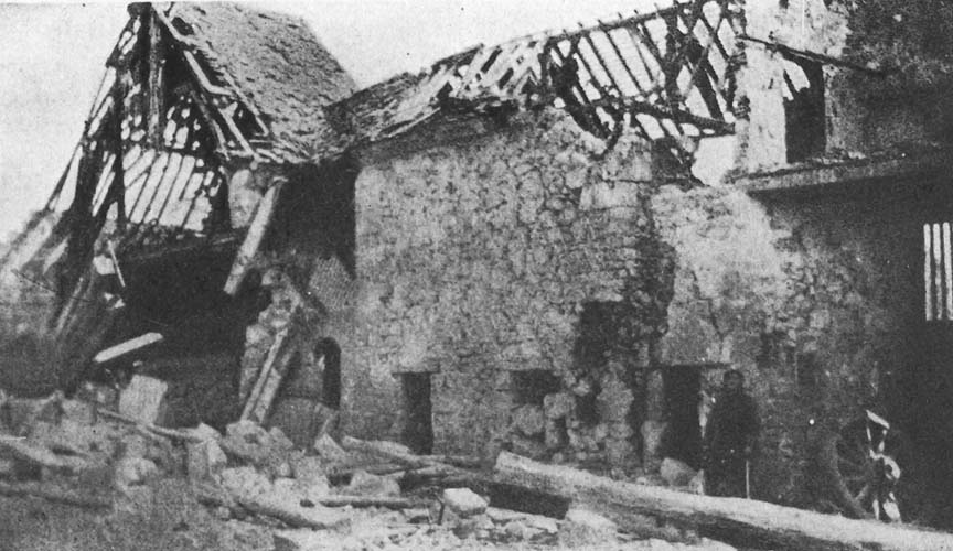 During the stay in this sector only two events stand out prominently. The first was in retaliation for an unexpected bombardment of a section of the Boche trenches and consisted in the dropping of some thousand gas-shells on Hermonville at a time when it was filled with sleeping soldiers. As a result the Section carried nearly five hundred gas cases out of the town in a day. Shortly after this the Boches took to nightly shelling of the Section's cantonment, finally culminating on the fourth night in a grand display of H.E. and gas, mixed. So the camp was moved to Prouilly!