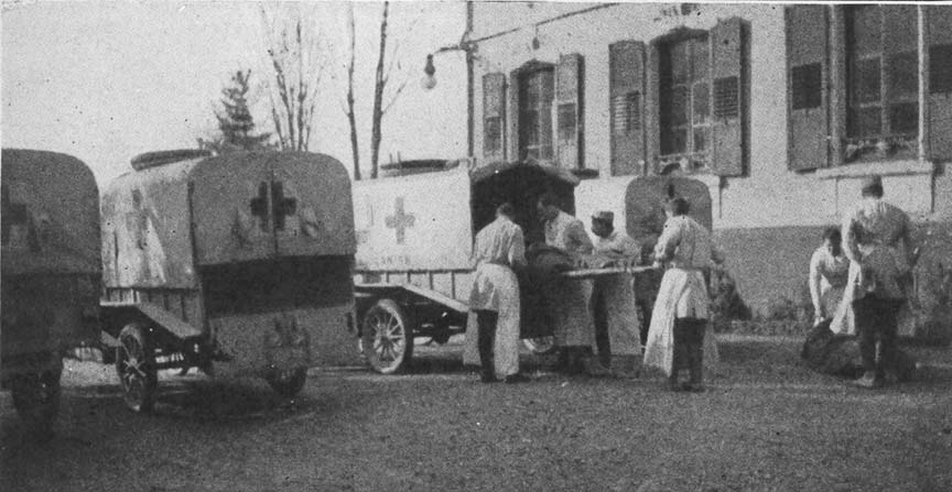 There is no need to tell of the ride in convoy, twenty cars following one behind the other, and every driver from the second car to the last damning the one in front for raising so much dust. Most of the things usual to gasoline cars happened, but at six-thirty that night the H.O.E. at Bouleuse --the evacuation hospital behind the Aisne front, where we were destined to pass our whole existence while members of the American Field Service --- saw twenty ambulances pull into the hospital grounds and forty-two dusty individuals crawl stiffly forth. Inside of five minutes every blessé able to walk, crawl, or to be assisted, was on hand to welcome the "américains" and to sell briquets.