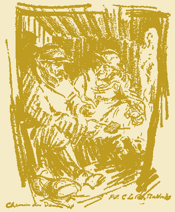 FOR a change of diet, "English" arranged a dinner for Richmond and me in the village at a small cottage where live two old Frenchwomen, who have been shelled from their own district and so have settled down here. You enter by a narrow alley, at the end of which are two doors, one leading into the stable, which is part of the cottage, while the other opens into the main room-kitchen, living- and dining-room all in one. In the centre is a large table with places set and goblets polished brightly, while at one end is an open fireplace with the mantel a foot from the low ceiling. On the hearth a small fire crackled and warmed three-legged pots in which our dinner was cooking. Above the table hung the wooden rack, familiar to these houses, laden with lard and bread. On the sides were suspended pots of every description, and in the corner opposite the stairway leading to the wine-cellar stood a grandfather's clock, which I have no doubt would be highly prized by an American. One of the old women cooked over the fire, while the other talked incessantly about all the noble families who lived near their former residence before the war. She had supplied them with milk, and so knew all there was to be known about their affairs. Finally, when the meal was ready, we found that we had an omelette, green peas, chicken, lettuce, a chocolate pudding with crackers, and, to finish, coffee with cream, which is considered quite a treat and is served in glasses. Persuaded by "English," the talkative one dived into the cellar and reappeared with a choice bottle of Burgundy. While at coffee, she suddenly became nervous, running back and forth into an outside room, for she had heard an aviator overhead and knew it to be a Boche. So she packed her belongings in a great handkerchief tied in a huge knot, dumped from a box into her apron the money which they had made selling eggs, beer, etc., to the soldiers, and went into the stable, where she took refuge under the cow, whence she finally came out long enough to allow us to pay for our supper. The bill amounted to five francs each, and it took her at least half an hour to figure it up.
