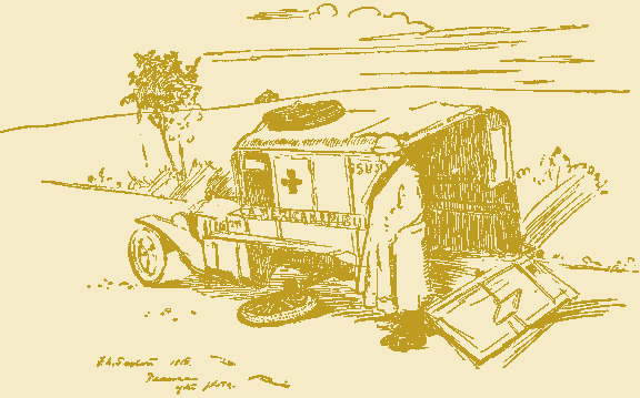 Meanwhile at Récicourt a call for special cars came by telephone from the outposts. Bingham had returned earlier in the evening from a call a little beyond "P. 4" with a report of the extent of the gas, and so, uninformed of the seriousness of the obstruction, though cognizant of the general condition of the road, Sous-Chef Mueller organized a squad of five cars, to answer this special call. When, however, this squad reached the blockade, they too realized the hopelessness of the situation, and while the men did finally succeed in climbing over the dead horses and wagon débris, leaving the cars behind, the gas was so bad that they, too, before they could return, were forced to seek shelter in an abri. At daybreak the squad, by using an artillery road to circumvent the obstruction, succeeded in bringing all of the wounded, unharmed, to the triage. By nine o'clock that morning the engineers had cleared a way, regular runs were reëstablished, and we were congratulating ourselves on our singular good fortune, for apparently the drivers on service the previous night had escaped unharmed, when during the afternoon they began to suffer extreme nausea, cramps, and flesh burns, and by evening were quite ill. In fact, over half the Section was thrown out of service, and despite the assistance of Section Seventeen and lessening of the work the following day, the men were too exhausted or ill to carry on much longer; so on August 17 Lieutenant Maillard asked that the Section be relieved.