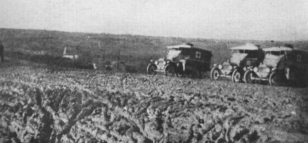 On August 16, 1917, twenty-one spick-and-span new Ford ambulances, a staff car, and camionnette formed in hollow square in the lower garden, and after an inspection by Mr. Andrew and some officers of the United States Army, rolled out of the gates in obedience to a series of unrehearsed and complicated whistle signals, concocted by our Chef to meet the emergency. Despite the signals and the ill-advised attempt of a car in the hands of a green driver to climb over the car ahead and wreck the stately trees of the garden, we passed out into the street and history, and toward the distant battle-line.