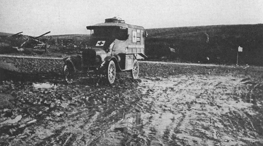 The road from the "cab stand" to the farthest poste was terrific. For a kilometre it was broad enough, straight and partly camouflaged, but after that it became narrow, crooked, and very rough. The surrounding country had once been wooded, with here and there a town, but now it was the symbol of desolation, a few upturned stumps and shattered logs being all that remained of a forest. As for the town sites, they were impossible to find, the terrain resembling the moon --- a mass of overlapping crater holes. After a rain these holes became partly filled with stagnant water and a stench arose that was horrible in its suggestiveness. Officially thousands upon thousands of soldiers have been reported "missing" on these fields. But, more literally, they have returned to clay. Such was the regained territory we traversed. The last stretch of road ran down a jagged gulch and terminated in a pool of filthy water. There being no room to turn around in the gulch, we always backed our cars down. This would be quite a feat under any circumstances because of the ever-present mud, stones, and débris, but we usually had to do it in total darkness, frequently in the midst of bursting shells.