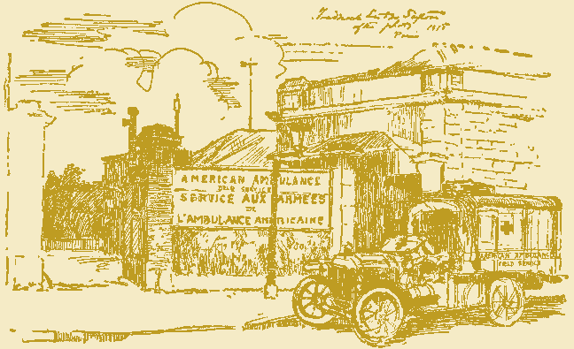 How many stories of the Service were told and retold at "rue Raynouard"! Many of them have become legends. You do not need to inquire of a man from Section Four how Rockwell and Crane with super-mechanical ability changed a rear axle with such precision that the ambulance had to be driven in reverse from the poste de secours to the cantonment --- every one knows it. The dread of "Hogan's Alley" is no one's possession. You of Sections Two and Four think you knew it best, but I am certain that any ambulancier can relate a tale about it with a thrill that will outstrip any of your real experiences. Section Three is convinced that it owns Alsace, but ask any man in the Service and he will tell you just where the "Charbonnier's Comer" is. Perhaps Section Eight does not know to this day how each individual ambulance travelled from Lorraine to the Somme during the 1916 attack, but ask anybody else how a "perfect convoy" should be run and he can tell you.