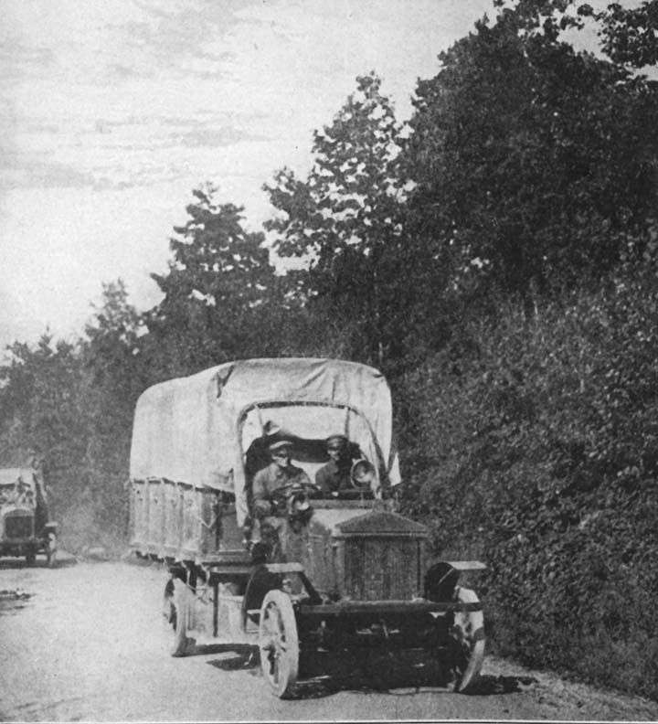 There have often been incidents like the following: A convoy of American-driven trucks approached a long stretch of road behind the front, and started down its length. Out ran a short, hairy-faced poilu. "N'allez pas là-bas. Très dangereux. Obus. Z-z-z-z, pouf! Pas bon." The road looked so peaceful; trees stood at frequent intervals; it surely was out of sight of the lines. And what a smooth, hard road it was. Why, we simply could n't miss such easy --- Woomp, Whee-e-e, Whang! A shell landed fifty yards down the road. The convoy was ordered to turn, while the little, serious-faced Frenchman pointed to a speck on the horizon, which was immediately recognized as an ever-watchful German observation balloon, which had already spied the convoy. "Je n'aime pas voir les américains tués. Avez-vous cigarette américaine? Merci. Au revoir."
