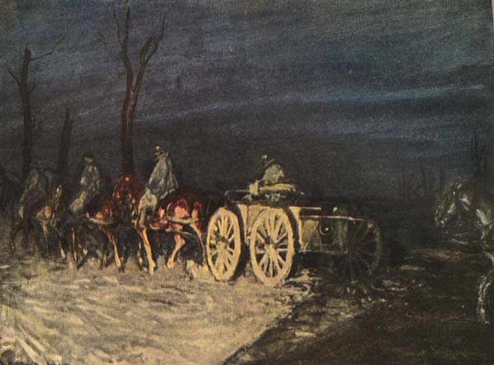 "Un blessé à Montauville --- urgent!" There's snow on the wind, there's rain on the wind, The night is as black as hell's black pit; The "Hundred-twenties" and "Seventy-fives" Christ! Do you hear that shrapnel tune Un blessé --- urgent? Hold your lantern up "Oui, ça ne dure pas longtemps, tu sais." "Bonsoir, messieurs --- à tout à l'heure!" Praise God for that rocket in the trench, "Courage, mon brave! We're almost there!" Go on, go on, through the dreadful night--- "Wake up, you swine asleep! Come out! "Il est mort, m'sieu!" "So the poor