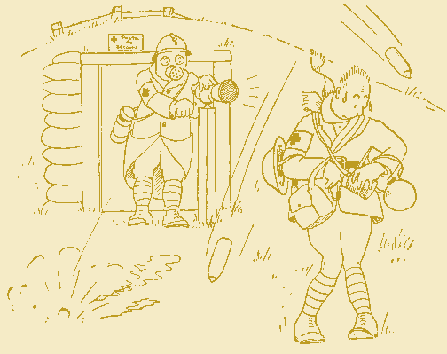 Bombs are seen bursting while two ambulanciers, with well-patched clothing, are working on their cars.