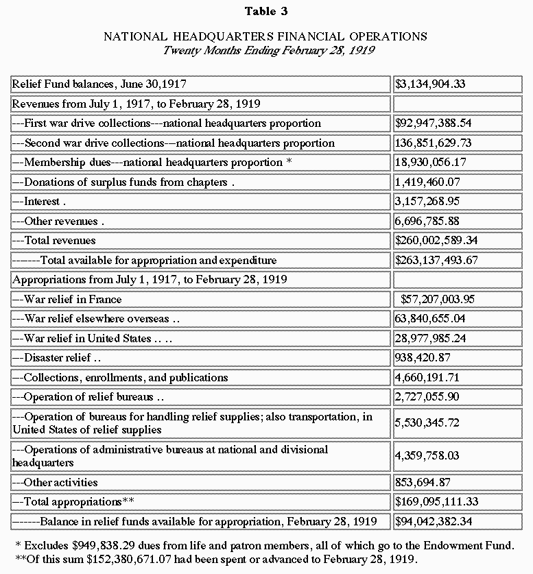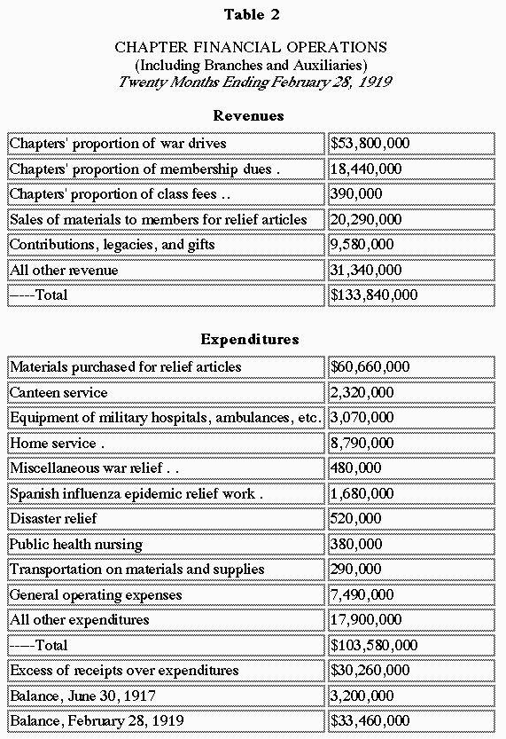 The following table shows the revenues and expenditures of chapters and national headquarters combined for the twenty months ending February ~8, 1919, round figures being used for simplicity: