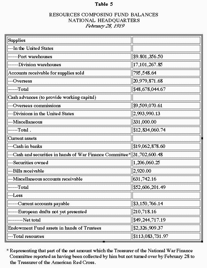 On July 1, 1917, the national headquarters had balances in relief funds aggregating $3,134,904.33. During the twenty months ending February 28, 1919, revenues aggregated $260,002,589.34, producing a total of $263,137,493.67 available for appropriation. From this amount $169,095,111.33 was appropriated, leaving balances in relief funds on February 28, 1919, aggregating $94,042,382.34- This balance, now substantially depleted by appropriations made since February 28, consisted of cash and securities $41,339,337.67, and supplies $52,703,044.67.[Note: Includes cash necessary to liquidate supply contracts.]