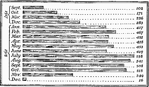 The growth of the Red Cross military hospital service during the months in which America was actively engaged in the fighting is shown in the following diagram: