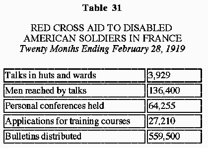 To assist American disabled soldiers, the Red Cross collected information for the United States Government and undertook an educational campaign to spread information concerning reconstruction possibilities. It is estimated that the majority of the 230,000 American troops who were injured in battle were reached by the Red Cross. Statistics concerning this work are given below: