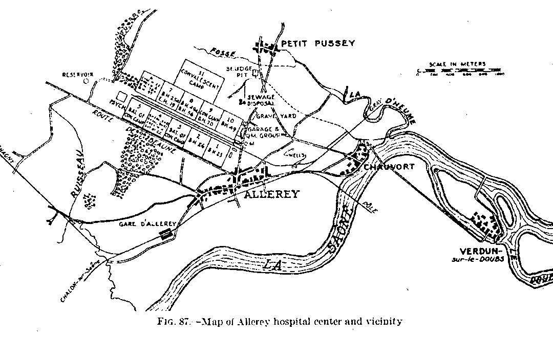 "The hospital center at Allerey was on the outskirts of the town whence it took its name. Allerey, at the time, was a town. of some 800 inhabitants on the Paris, Lyon, & Mediterranean Railroad, in the Department of Saône-et-Loire, approximately 11 miles north of Chalons-sur-Saône, the largest town (population, 30,000) of the department. The center was about three-quarters of a mile from the Saône River, which was at once, in effect, the source of its water supply, and a line of communication over which fuel and other supplies were brought to the center when access by rail was obstructed