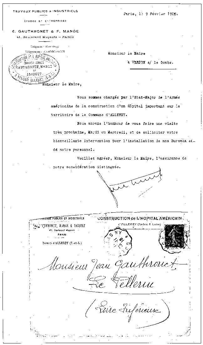 The construction of the camp barracks had been contracted out to General Constructors Gauthronet, Mage et Jacquet, from Paris, who, in early February, had set up one office in the Allerey train station and another in Verdun, and later, in May 1918, in the camp itself.. On February 15, the sub-prefect had asked the mayor of Verdun to find furnished lodgings in the towns around Allerey to house the engineers and diverse personnel of the Gauthronet company. Secretaries were hired: Mlle Chapot, from Verdun, Mlle Clémence Bonnot, from Verdun (who would later marry and American), Mlle Alice Develle de Palleau ( M. Gauthronet's personal secretary, who would marry his son), Mlle Gros and Mlle Légeley, of Allerey. At the engineering office there were a Frenchman and two Swiss, and two or three draftsmen at the drafting office. The company's secretary general served as the interpreter.