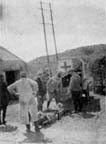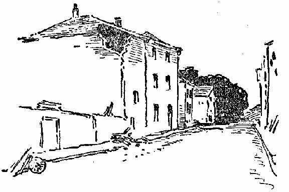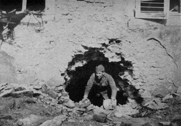 Fig. 14. House in which the nine men were sitting when hurled to the floor by shell exploding just outside. Soon afterwards a shell arrived making the large hole shown---and completely demolishing things within.
