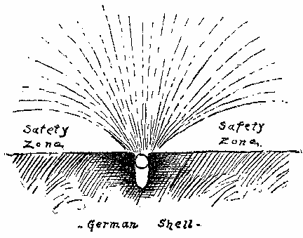 [*NOTE: This effect may be due to the fact that the German shells have percussion fuses whose action is less rapid than that of the French shells. This would allow them to penetrate the target or ground before detonation, and would give them the geyser effect sketched. In the French shells, with less delay action in the fuse, the explosion would take place more immediately on impact, giving a more lateral burst effect. Of course the delay in the fuses is easily varied by the gunners.]