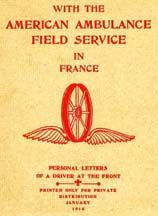 From the outset it was clear that the saving of soldiers' lives depended quite as much upon the quick transportation of the wounded as upon their surgical treatment, and in September, 1914, when the battle front surged close to Paris, a dozen automobiles given by Americans, hastily extemporized into ambulances, and driven by American volunteers, ran back and forth night and day between the western end of the Marne Valley and Paris. This was the beginning of the American Ambulance Field Service with which the following letters have to do. During the autumn and winter that followed many more cars were given and many more young Americans volunteered, and when the battle front retired from the vicinity of Paris, sections of motor ambulances were detached from the hospitals at Neuilly and Juilly and became more or less independent units attached to the several French armies, serving the dressing-stations and Army hospitals within the Army zone. To-day more than a hundred such ambulances given and driven by American friends of France are carrying wounded French soldiers along the very fighting front in Belgium and France.