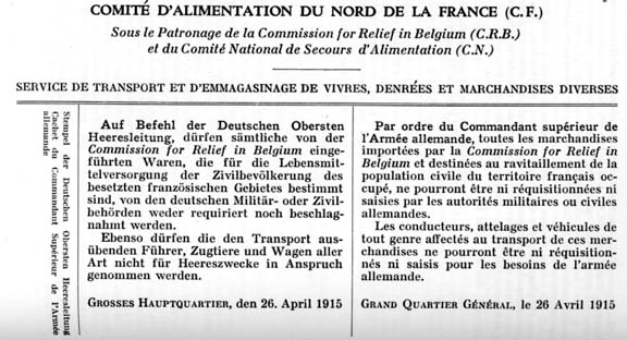 Auf Wunsch des Comité Hispano-Néerlandais pour la protection du Ravitaillement en Belgique et dans le Nord de la France, gibt hiermit die Deutsche Oberste Heeresleitung, vertreten durch den Generalintendanten des Feldheeres die Zusicherung, dass die Sämereien irgend welcher Art, die, sei es von der "Commission for Relief in Belgium" oder von dem Comité d'alimentation du Nord de la France in das besetzte Gebiet von Nordfrankreich und belgische Etappengebiet eingeführt werden, von jeder Beschlagnahme befreit sind.