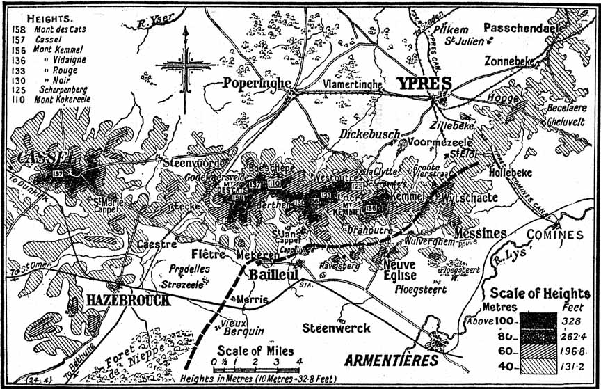 As two years ago we found our way---the hard-worked Stirling, Sir Anthony Bowlby, and I---from Hazebrouck eastward, with the range of low hills on our left, extending from Cassel to Kemmel, just north of which is the Scherpenberg, where we stood on that occasion. Between this landmark and Kemmel lies Mont Noir---almost leveled for its product of sand to fill bags, to make road beds and concrete; this. we cross and find our way to the top of Mont Rouge, where from a little knoll one gets a great sweep of the ridge. Even so it is difficult to get a clear idea of what is going on, particularly when one does not know the plays, and, being somewhat hazy, the visibility is not of the best. But we can see the long rows of observation balloons---unusually high and looking like curled-up slugs---probably 20 of them, whereas beyond the ridge we can make out only two German balloons. Aeroplanes of course were working everywhere and the artillery fire was very heavy---directed over the ridge by now, for the German stronghold on the crest perfected during two years' occupancy had been taken almost at the first rush.