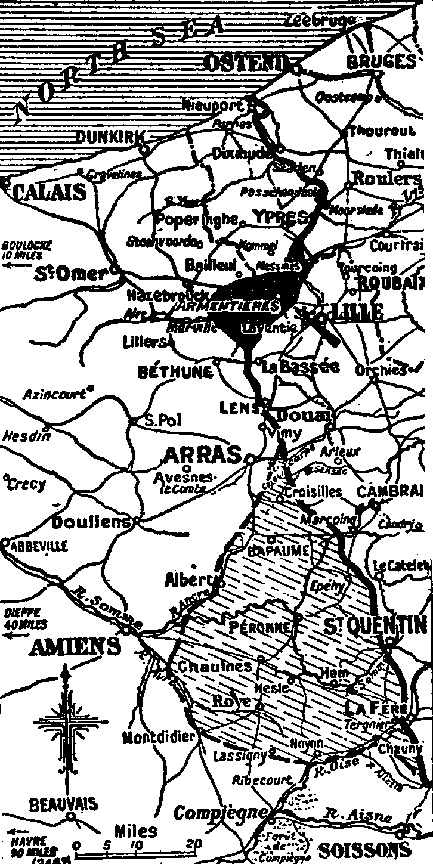 Both the first and this second phase of the German offensive concern chiefly the control of important railways. The object of the first was to put the Boulogne-Amiens-Paris line out of commission and this they have nearly accomplished. In this second phase the territory lies directly opposite Lille, which for the Boches is a great railway junction. On the Allied side, Hazbrouck and Béthune are the essential centres, the loss of which would seriously affect the lines of communication to the British front in the North.