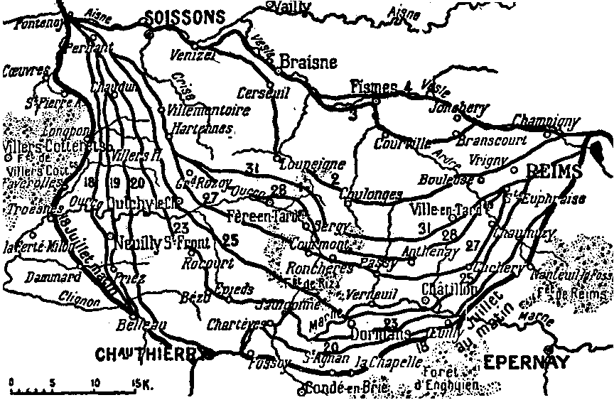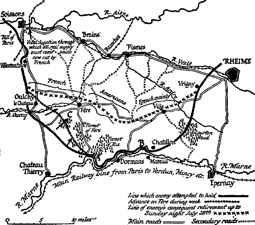 On Sunday the 21st, the day of the Séry-Magneval mess, Franco-American troops moved up practically to the Soissons-Château-Thierry road, seriously threatening the enemy's line of communication. Château-Thierry was taken and they were forced to make a complete withdrawal north of the Marne. They began extricating themselves cleverly behind a screen of smoke and machine guns---meanwhile excusing their withdrawal by similar methods in the communiqués.