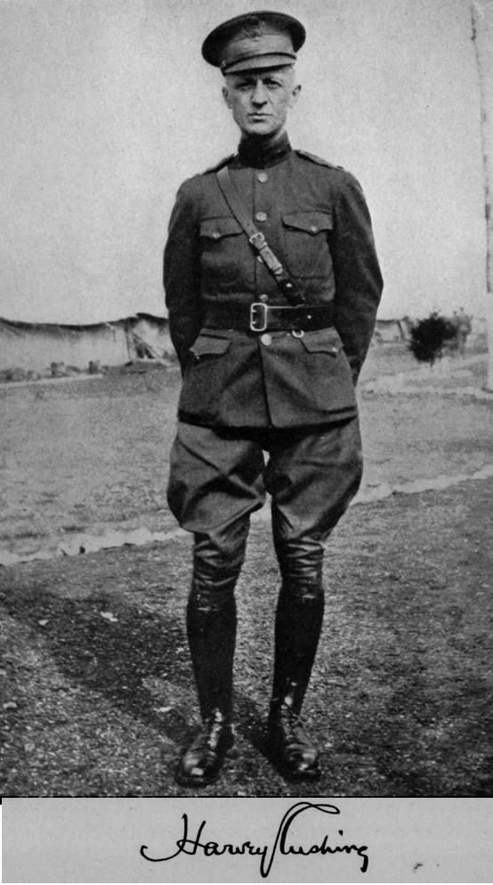 Dr. Cushing saw the war on the Western Front at close quarters. His first duty was in the early spring of 1915 when he served with a Harvard Unit in the American Ambulance at Neuilly, France. At that time he became familiar with the French Service de Santé. From Paris he went on a visit to the Royal Army Medical Corps and saw at first hand their work in Flanders. On his return to this country, as part of the preparedness campaign, he set about organizing one of the Base Hospital Units which were recruited from the professional staff of a number of university medical schools. As director of one of these units, known as Base Hospital No. 5---the second military organization of any kind officially sent overseas---he sailed for France again in May 1917. Throughout that year he served as an operating surgeon with the B.E.F., being detached from the Unit for special duty during the battles for the Messines and Passchendaele ridges. In June 1918 he was transferred to the Medical Headquarters of the A.E.F. as senior consultant in neurosurgery, and participated in the three major engagements at Château-Thierry, St. Mihiel, and the Argonne.