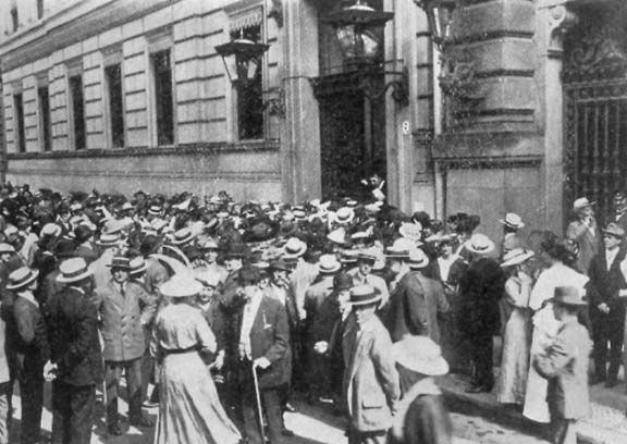 Of course, during these days the population of Berlin was greatly excited. Every night great crowds of people paraded the streets singing "Deutschland Ueber Alles" and demanding war. Extras, distributed free, were issued at frequent intervals by the newspapers, and there was a general feeling among the Germans that their years of preparation would now bear fruit, that Germany would conquer the world and impose its Kultur upon all nations.