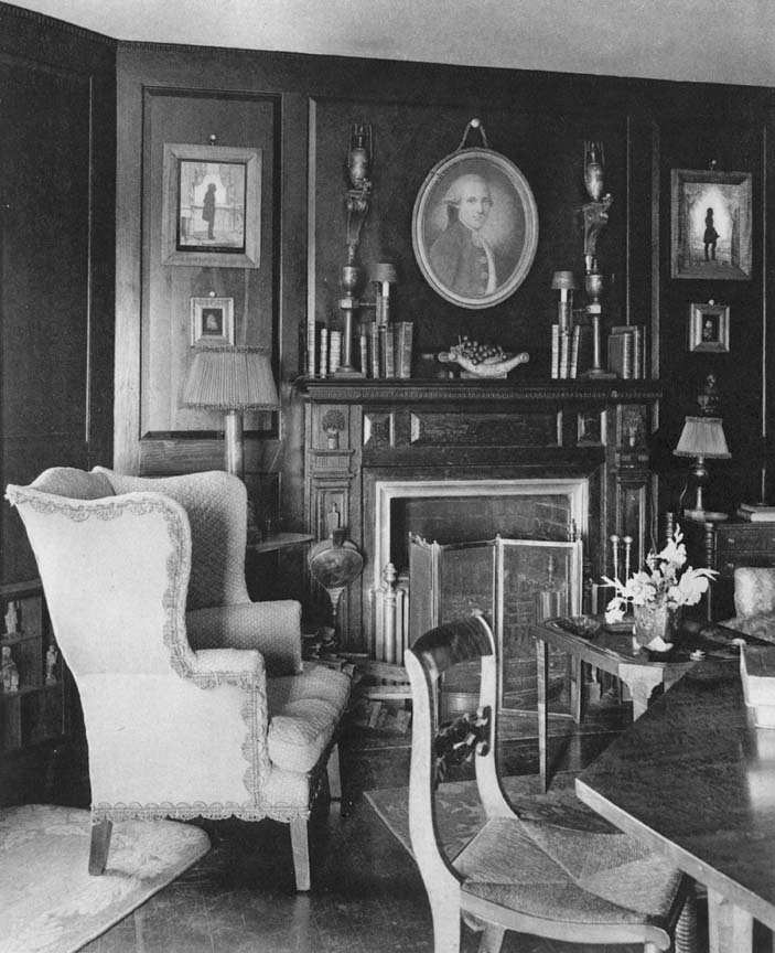 | All woodwork in this "first dining-room" is painted the green of the back of a laurel leaf, the floor is dark waxed-brick. The graceful Adam mirror picks up the copper on the ledge of the east wall. |