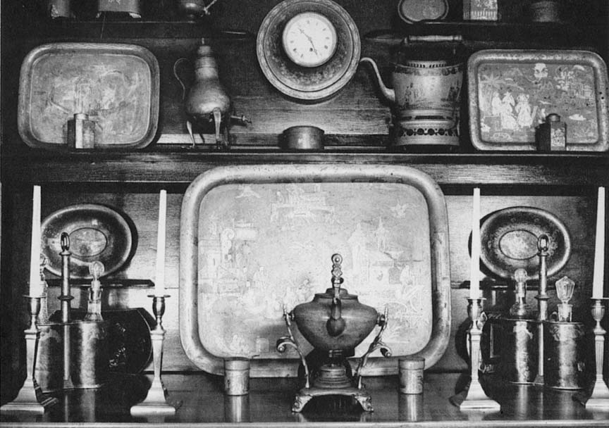 | General Washington, hollow, complete with toga, scroll, hat and sword, is an old Albany stove of most realistic warmth. His escorting eagles are repeated on the painted chair-top. |